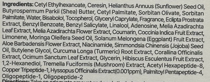 Formula conține extract de Hyssopus officinalis (0,001 ppm) – un extract vegetal cu proprietăți calmante și antioxidante. Aloe vera adăugat are efect calmant și hidratant, făcând balsamul potrivit chiar și pentru pielea sensibilă. Complexul de peptide sprijină netezirea liniilor fine și îmbunătățește elasticitatea pielii.