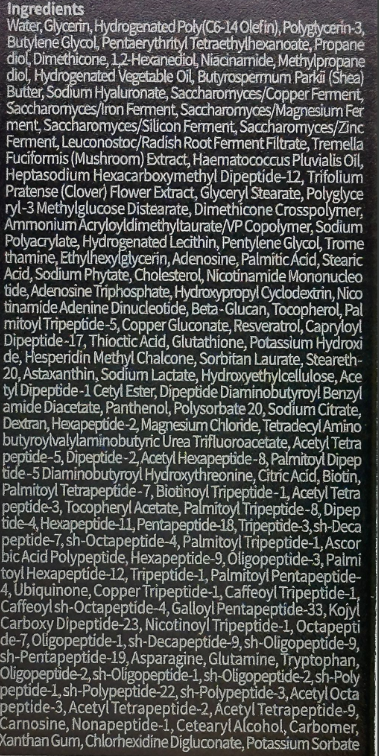 Esenta cu 50 de peptide, acid tioctic și niacinamidă combină o matrice puternică de peptide care stimulează regenerarea, consolidează structura dermului și îmbunătățește vizibil elasticitatea pielii. Formula este îmbogățită cu niacinamidă, care iluminează tenul și sprijină uniformitatea texturii pielii. Adenozina inclusă acționează ca un modulator energetic celular, contribuind la netezirea liniilor fine. Acidul tioctic (acid α-lipoic) oferă o protecție antioxidantă puternică, contribuind la un aspect mai neted și tonifiat. Super-antioxidantul astaxantina protejează pielea împotriva factorilor de stres extern și sprijină un aspect sănătos și ferm.