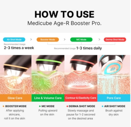 Informații detaliate despre MediCube Age-R Booster Pro Rezultate clinice Booster Mode Permeabilitatea pielii: Îmbunătățită cu 785% Stralucirea pielii: Îmbunătățită cu 11,4% după 2 săptămâni de utilizare. Decolorare: îmbunătățită cu 1,98% după 4 săptămâni de utilizare. Tonul pielii: îmbunătățit cu 1,8% după 4 săptămâni de utilizare. Hidratarea: îmbunătățită cu 1,73% după 2 săptămâni de utilizare. MC ModeForehead Volum: îmbunătățit cu 35,9% după 2 săptămâni de utilizare. Smile Lines: îmbunătățit cu 24,2% după 2 săptămâni de utilizare Between The Brows (11s) : îmbunătățit cu 16,1% după 2 săptămâni de utilizare. 2 săptămâni de utilizare Densitatea pielii: îmbunătățită cu 5,46% după 2 săptămâni de utilizare Mod Derma Shot Pungă inferioară pentru ochi: scădere cu 15,3% după 2 săptămâni de utilizare Obraji lasați: scădere cu 5,31% după 2 săptămâni de utilizare. Bărbie: reducere de 1,21 cc după 2 săptămâni de utilizare Mod Air Shot Permeabilitatea pielii: Crește cu 791% Numărul de pori: scădere cu 34,5% după 2 săptămâni de utilizare Piele moartă: scădere cu 27,4% după 2 săptămâni de utilizare. 1 săptămână de utilizare Lungimea verticală a porilor: scădere cu 9,04% după 1 săptămână de utilizare Piele aspră: scădere cu 6,68% după 2 săptămâni de utilizare *Rezultatele pot varia de la o persoană la alta *Extract dintr-un raport de testare clinică privind utilizarea Booster Pro (4 moduri) în combinație cu produse de îngrijire a pielii Întrebări frecvente Trebuie să folosesc gelul special când folosesc regimul de derma shot? - Nu. Poate fi folosit fara gelul special prin aplicarea frecventei corespunzatoare muschilor faciali. Vă rugăm să-l utilizați împreună cu îngrijirea pielii pe care o utilizați în mod normal. Pot folosi toate cele 4 moduri? - Da, patru moduri pot fi utilizate simultan. După ce ați folosit modul Air Shot pe piele uscată, utilizați modurile booster, microcurent și derma shot împreună cu îngrijirea obișnuită a pielii. Instructiuni de utilizare?