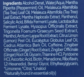 Охлаждащ и успокояващ тоник за скалп с етерично масло от чаено дърво, екстракт от чаено дърво, BHA (салицилова киселина), мента, евкалипт, който регулира маслен баланс.