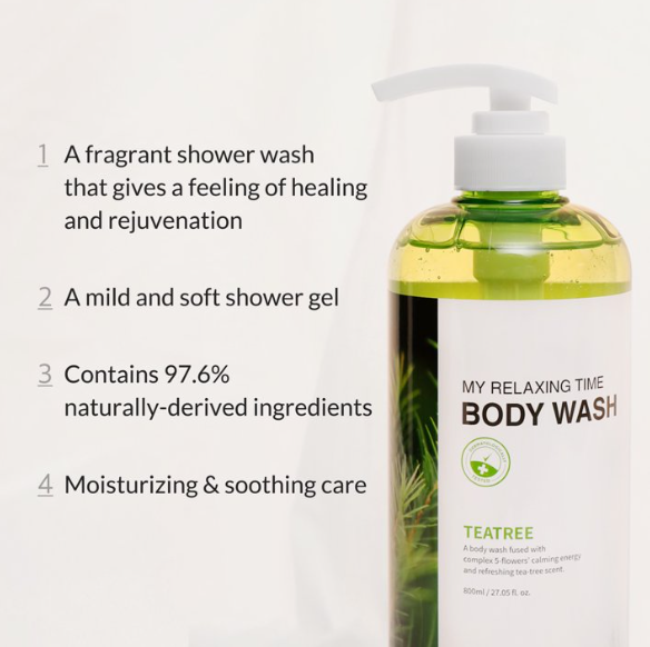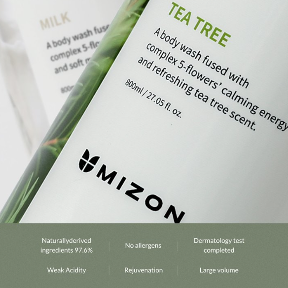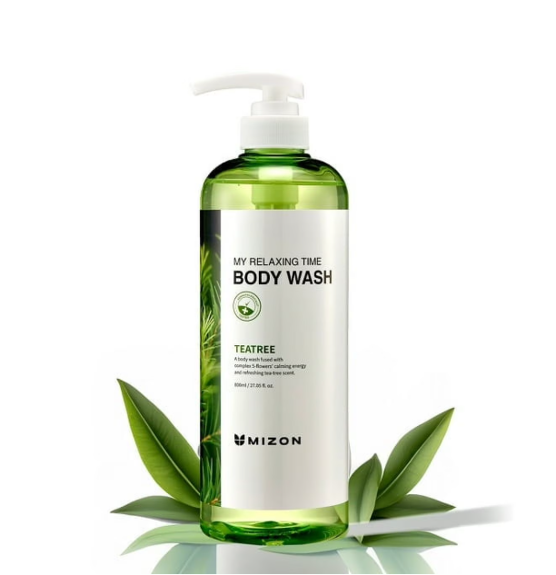 Mizon My Relaxing Time Body Wash Tea Tree - Душ гел с екстракт от чаено дърво, насочен към почистване, овлажняване, тонизиране и възстановяване на хидролипидния баланс на кожата. Лек душ гел със съставки, които осигуряват прекрасно усещане за аромат, който докосва сетивата. Заедно с противовъзпалителните и подхранващи ползи, това е идеалното средство за успокояващ душ след дълъг ден. Дерматологично тестван продукт, който съдържа комплекс от 5 вида цветя и екстракт от чаено дърво. Екстракт от листа на чаено дърво - антисептични, противовъзпалителни и антибактериални свойства. Ефективен срещу акне. Екстракт от невен - подходящ при заздравяване на рани, съдържащ флаваноиди, които имат противовъзпалителни и антиоксидантни свойства. Екстракт от сусамово семе - богат на антиоксиданти и полезни за кожата ненаситени мастни киселини, фитостероли и витамин Е.