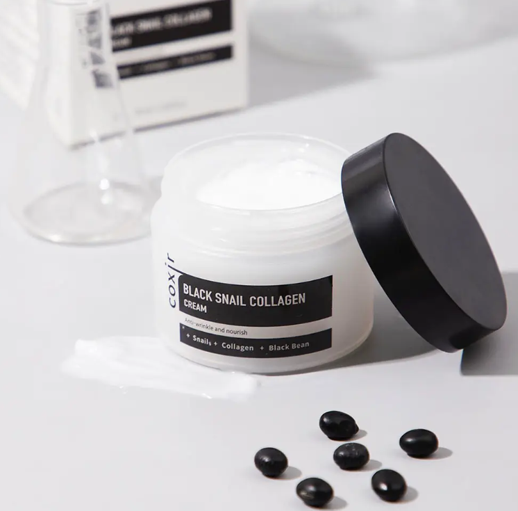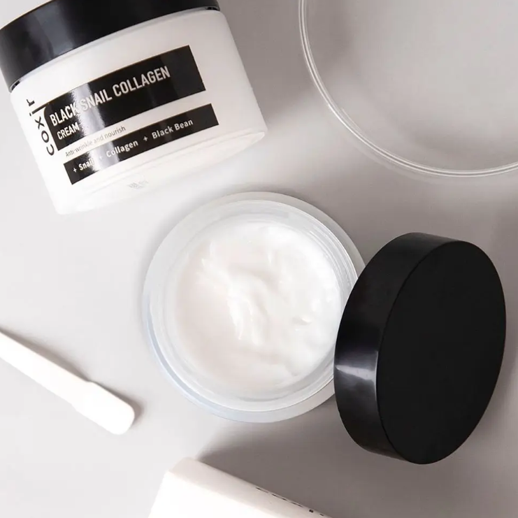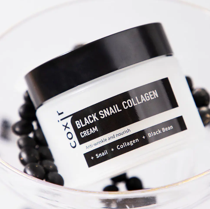 Крем за лице против бръчки с филтрат от секрецията на охлюв, аденозин и колаген. Coxir Black Snail Collagen Cream е отличен крем против стареене на кожата, за кожа, загубила своята еластичност. Продуктът съдържа охлювен муцин, който ускорява регенерацията на кожата, колаген, подхранващо масло от шипка, екстракт от женшен и силните съставки против стареене - аденозин и меден трипептид. Кремът бързо освежава уморената кожа и възстановява еластичността. Продуктът стимулира обновяването на клетките на кожата. С редовна употреба ще забележите, че лицето ви е меко и приятно на допир. Бръчките, причинени от дехидратация, ще се минимализират, белезите от пост акне ще изчезнат. Кремът има фина текстура, която леко се разтяга - поради високата концентрация на муцин от охлюв. Кремът се абсорбира бързо и не оставя лепкавост.